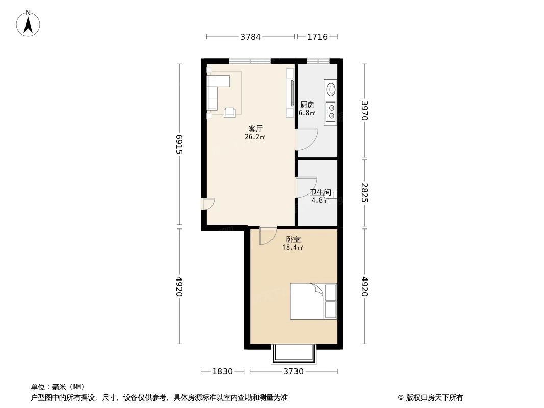 户型齐全,主打户型方正,明厨,客厅朝南,主卧朝南一居