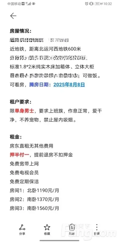 房屋情况: 通州农行家属院3—2—401室 近地铁,距离北运河西地铁600米 步行梯四楼,三居无客厅,每户一人 标准1.8*2米纯实木床加箱体、立体大柜 民水民电,集体供暖,家具齐全,可做饭。 可看房,腾房日期:2025年8月8日 租户要求: 限单身女士,要求上班族,作息正常,爱干净,不养宠物,禁止屋内吸烟。 租金: 房东直租无其他费用 押半付一,提前退房不扣押金 免费宽带上网 免费电视会员 免费定期保洁 房间1:北卧1190元/月 房间2:南卧1370元/月 房间3:南卧1560元/月