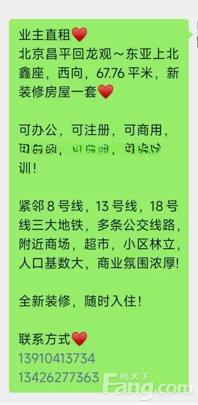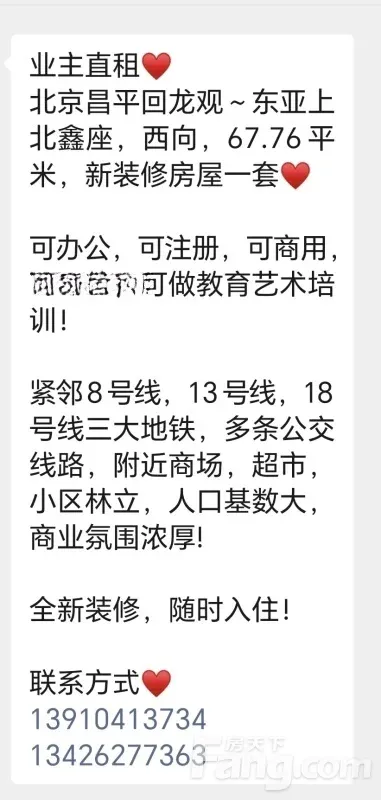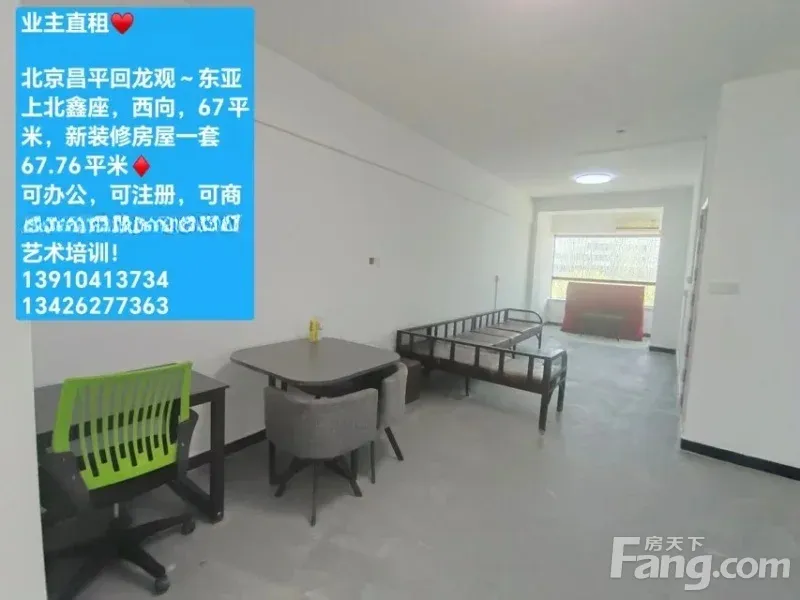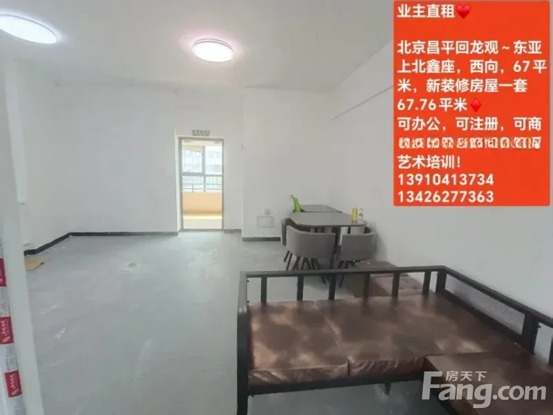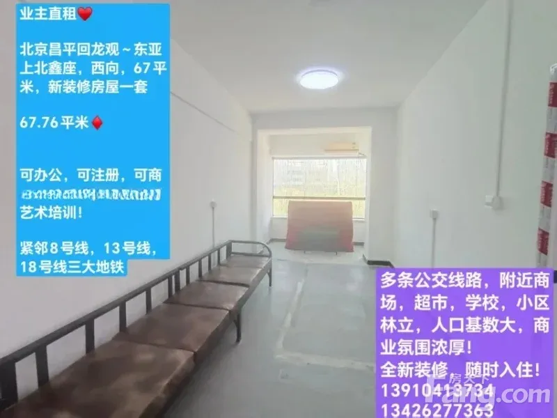 业主直租? 北京昌平回龙观~东亚上北鑫座,西向,67.76平米,新装修房屋一套? 可办公,可注册,可商用,可居住,可做教育艺术培训! 紧邻8号线,13号线,18号线三大地铁,多条公交线路,附近商场,超市,小区林立,人口基数大,商业氛围浓厚! 全新装修,随时入住! 联系方式?