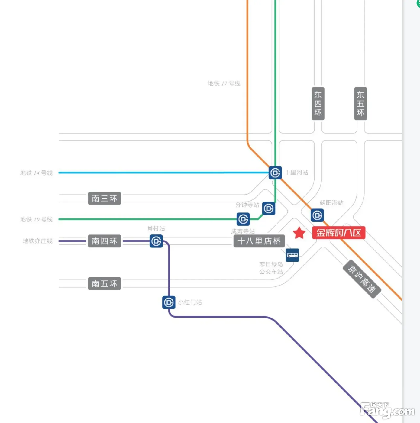 高速:南四环,南五环,京沪高速,京津高速,京哈高速,京台高速等 地铁:地铁10号线、14号线、17号线“十里河”站出口处 公交: 400路外环;400路外环区间(公益西桥);400路快车外环;602路;865路等