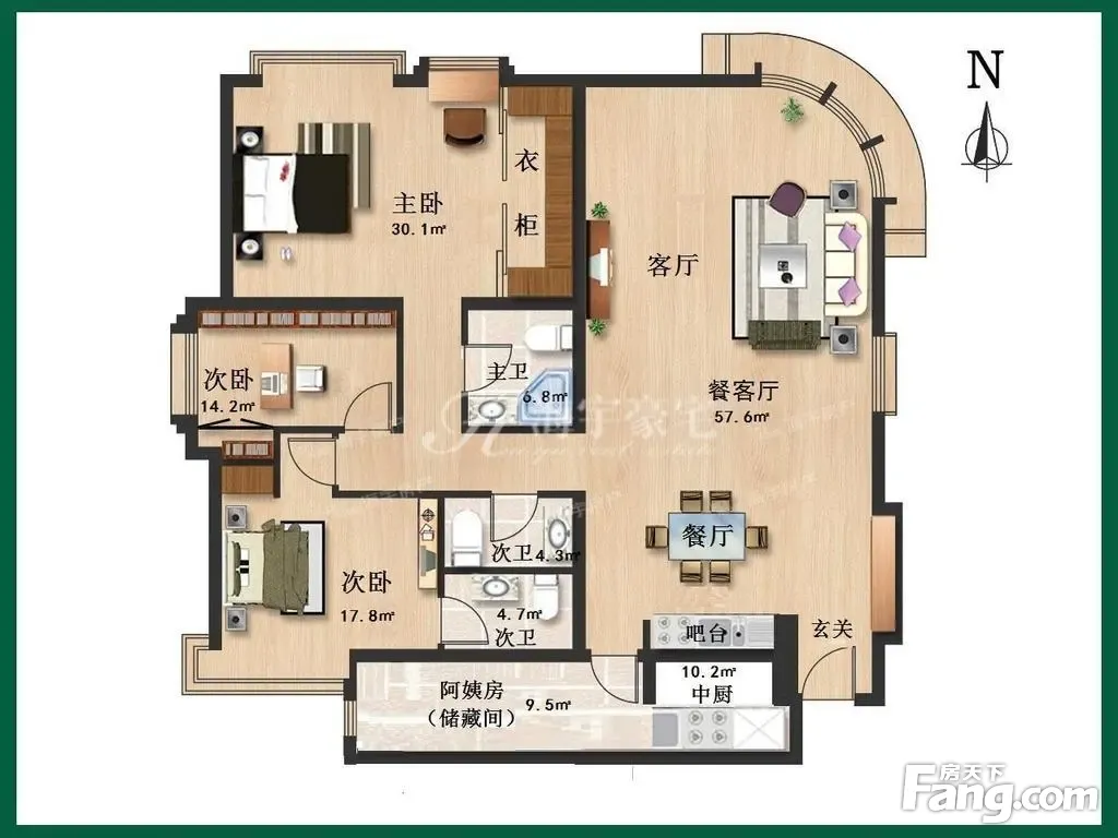 二次装修大3居 3卫设计 弧形飘窗看小区花园 带储物间功能全