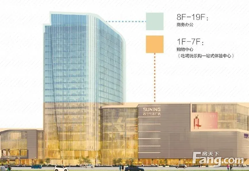 苏宁生活广场总建筑面积99755平米,地上7层至19层为 写字楼,写字楼单层建筑面积1800平米;负1层至地上6层为卖场,包括大型电器卖场、特色餐饮