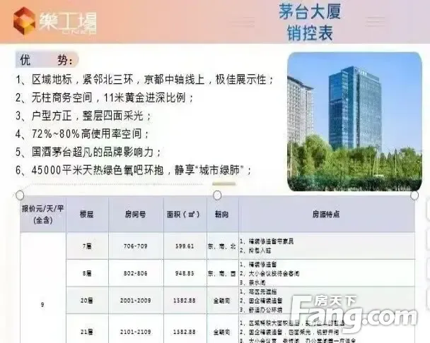 茅台大厦整层1583平米 【位置】:西城区北三环中路 【面积】:可分割,可连层 【付款方式】:押三付三 【签约年限】:2-3年,遗留现状交付,随时可签 【层高】:2.7米 【使用率】:标准层72%,整层80% 亮点:国企户型方正减免政策交通方便 交通:地铁12号线马甸桥站步行3 亮点:国企 户型方正 减免政策 交通方便 交通:地铁10号线健德门站780步行8(12号线在建,2024年开通)公交四通八达:671、604、601、302、361 特5等30余条线路 商业配套:民生银行、茅台酒展厅、醉韵文化主题餐厅、多功能会议厅 入住客户:国家电投、有色金属集团、中科院科技发展有限公司、中电建保险经纪有限公司等名企云集 2025年还有其他大量房源信息: 1、阜成门地铁口万通金融中心:70㎡、71㎡、96.83㎡、108㎡、140㎡、141㎡、139㎡、386㎡、288㎡、139.22㎡、186㎡、245㎡、280㎡、289㎡、350㎡、370㎡、550㎡、634㎡、700㎡、754㎡、900㎡、1300㎡、整层2400㎡可分租 2、金融街月坛大厦102㎡,豪华精装修,办公家具齐全,拎包入驻;1000㎡,遗留装修,可分租 3、独栋写字楼:阜成门大厦整栋6839㎡、动物园站金融科技中心独栋9115㎡、西直门花园式独栋写字楼750㎡、400㎡、700㎡,4元、金融街商圈独栋880㎡、西海48独栋420㎡、德胜门外独栋5412㎡、百万庄独栋6500㎡、钓鱼台山庄1200㎡、金融街平安里独栋4层1700㎡和、2076㎡、1300㎡、西三环花园桥独栋1500㎡、西三环紫竹桥1286㎡、西二环1286㎡、西二环天宁寺5450㎡、车公庄独栋1500㎡2500㎡、金融街4713㎡、西二环临街独栋1500㎡、地铁动物园站独栋580㎡挑高5米 4、阜成门地铁站国润240㎡、180㎡、450㎡、2|3|4|8人间(水电物业暖气空调饮品全含) 5、阜成门京润大厦280㎡之1500㎡ 6、月坛恒华商务写字楼378㎡、326㎡、327㎡、153㎡、310㎡、190㎡、210㎡ 7、阜成门地铁口四川大厦42㎡、80㎡、100㎡、150㎡、190㎡、300㎡、880㎡、922㎡ 8、阜成门商务纯办公写字楼350㎡、700㎡5元 9、阜成门外大街外经贸大厦:1365㎡、1143.08㎡、159㎡、314㎡、479㎡、1622㎡、2125㎡、1936㎡、3300㎡、500㎡ 10、金融街丰汇时代大厦954㎡、1371㎡、2281㎡、246㎡、160㎡、246㎡ 11、金融大街富凯大厦116㎡、337㎡、375㎡、169㎡、205㎡、460㎡、1000㎡、1030㎡、 12、金融大街国际企业大厦314㎡、270㎡、274㎡、272㎡、268㎡、264㎡ 13、月坛建威大厦186㎡(精致装修)、85㎡、104㎡、128㎡、181㎡、120㎡、186㎡、753.43㎡、267㎡、169㎡、146㎡、222㎡、739㎡、182㎡、119㎡、370㎡、530㎡、534㎡、146㎡、286㎡、147㎡、658㎡、208㎡、758㎡、208㎡、228㎡ 14、金融大街新盛大厦96㎡、398㎡、500㎡、2128㎡、4256㎡ 15、金融街长安兴融369㎡、186㎡、822㎡、369㎡ 16、金融街金隅大厦166687㎡、179㎡、378㎡、1988㎡、806㎡、289㎡、503㎡、518㎡ 17、通泰大厦330㎡、306㎡ 18、投资广场122㎡、800㎡、520㎡、 19、西单通港大厦58㎡、195㎡、261㎡、313㎡、468㎡、727㎡、753㎡、1435㎡、 20、车公庄地铁口新时代大厦1156㎡、451㎡、1178㎡、452㎡ 21、金融街复兴门地铁口远洋大厦400.87㎡、193.66㎡、194㎡、200㎡、178㎡、466.8㎡、512㎡、190.6㎡、303.6㎡、725㎡、266㎡、264㎡、260㎡、575㎡、334㎡、434㎡、176㎡、227㎡、247㎡、179㎡、270㎡ 22、金融街中环世贸431㎡、264㎡、353㎡、354.66㎡、773㎡、1122㎡、1350㎡、630㎡、160㎡、 23、金融街卓著大厦466㎡、460㎡、780㎡ 24、金融街公寓整层697㎡ 25、国兴大厦660㎡、 26、西直门外大街凯旋大厦753㎡、296㎡、253平米米、369㎡、463㎡、635㎡、335㎡、368㎡、整层面积3157㎡ 27、西直门西环广场:355㎡、750㎡、237㎡、160㎡、425㎡、165㎡、282㎡、560㎡、176㎡、300㎡、169㎡、 28、西直门外中坤大厦:825㎡、134㎡、824.08㎡、267㎡、557㎡、235㎡、260㎡、762㎡、188㎡、267㎡、740㎡ 29、主语国际中心:275㎡、526㎡、1080㎡、1541㎡ 30、电信实业大厦768㎡ 31、甘家口大厦254㎡、264㎡、280.68㎡、313.91㎡、399.56㎡、263.25㎡ 32、六里桥奈伦大厦 ;698㎡、296㎡、955㎡、698㎡、236㎡、209㎡、86㎡、904㎡、445㎡、530㎡、321㎡、172㎡、361㎡、175㎡、196㎡、371㎡、535㎡、731㎡ 33、宣武门环球财讯中心880㎡ 34、西直门成铭大厦56㎡、103㎡、290㎡、740㎡、357㎡、47.83㎡、643㎡、1000.67㎡、1105㎡、950㎡、105㎡、337㎡、573㎡、549㎡、731㎡、304㎡、176㎡、2203㎡、 35、宣武门地铁口庄胜广场173㎡、142平米、106㎡、88㎡、366㎡、474㎡、675㎡、500之16000㎡可根据需要进行分割面积 36、广安门港中旅大厦173.5㎡、392。22㎡、692㎡ 37、西直门金贸中心写字楼66㎡、101㎡、106㎡、68.32㎡、108㎡、550㎡、700㎡ 38、车公庄五栋大楼写字楼137㎡、160㎡、280㎡、453㎡、1200㎡、1100㎡ 39、西客站国投财富广场138㎡、1320㎡、1330㎡、140㎡ 40、广安门朗琴国际大厦460㎡、800㎡、2100㎡、300㎡、180㎡、 41、西直门外动物园站方圆大厦1060㎡、760㎡,5元 42、阜成门国宾大厦180㎡、370㎡、290㎡、340㎡、710㎡、 43、西单大悦城写字楼:423㎡、122㎡、200㎡、175㎡、286㎡、359㎡、771㎡、620㎡、112㎡、652㎡、117㎡、360㎡、270㎡、421㎡、780㎡、244㎡、1500㎡、660㎡、154㎡ 44、马甸德胜门区域茅台大厦599.61㎡东南北、948.85㎡东南西、926.13㎡全朝向、1583㎡全朝向、1582.88㎡全朝向、1564㎡全朝向、1582.37㎡全朝向 45、魏公村地铁口北京.国际827㎡、 824㎡、 315㎡、 173㎡ 、686㎡、 890㎡、 700㎡ 46、西四地铁口西什库大街独立整层面积1105