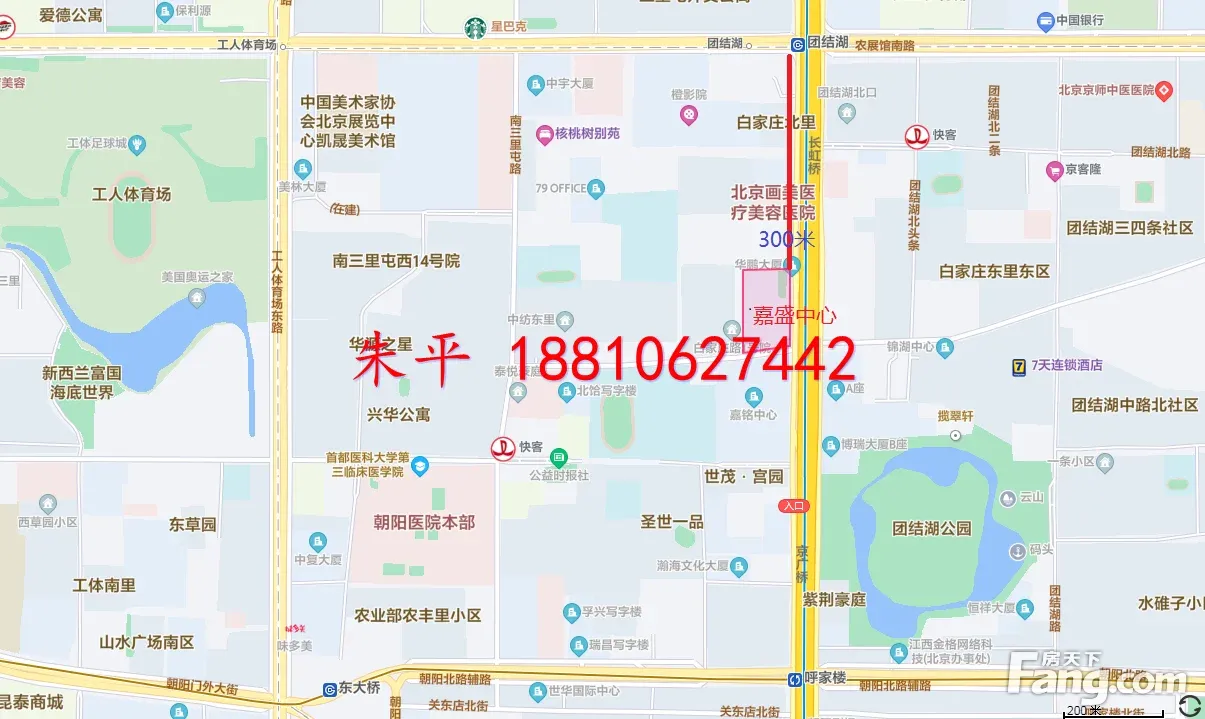 ★★★ ★★★ ★★★ 租赁热线:188 1062 7442 ========================= 【名称】 :嘉盛中心 【面积】 :300㎡ 【价格】 :4元/㎡/天 【情况】 :全新装修、全套家具、高区东三环视野、有5个隔间、24-30人工区、全套家具 【交通】 :地铁3/6/10号线团结湖站、呼家楼站;113路、368路、300路、405路等多路公交皆可到达白家庄北站下