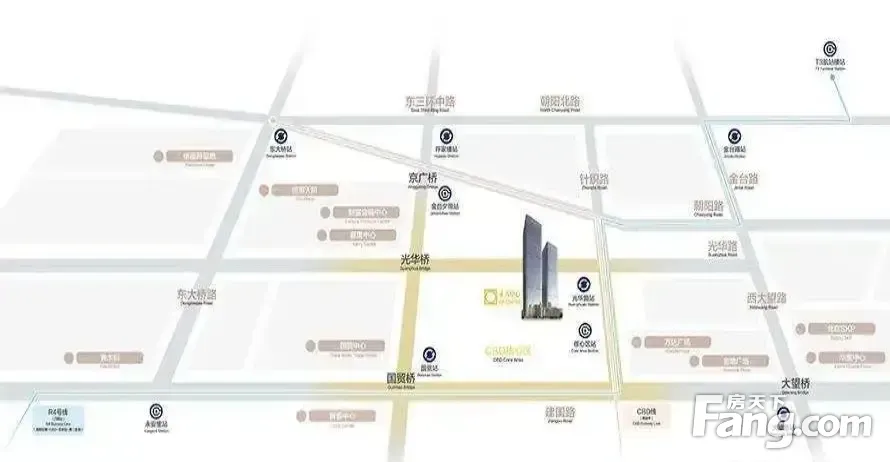 坐落于东长安街国贸以东900米处 西起西大望路,东临东四环,南至通惠河,北临朝阳路, 公交1、4、11、30、31、57、205、207、312、402、405、608、710、712、721、728、752、808、847、848、852、976、976、984、特1路等 ;距首都机场约30KM 地铁1、10/14号线国贸、大望路地铁站