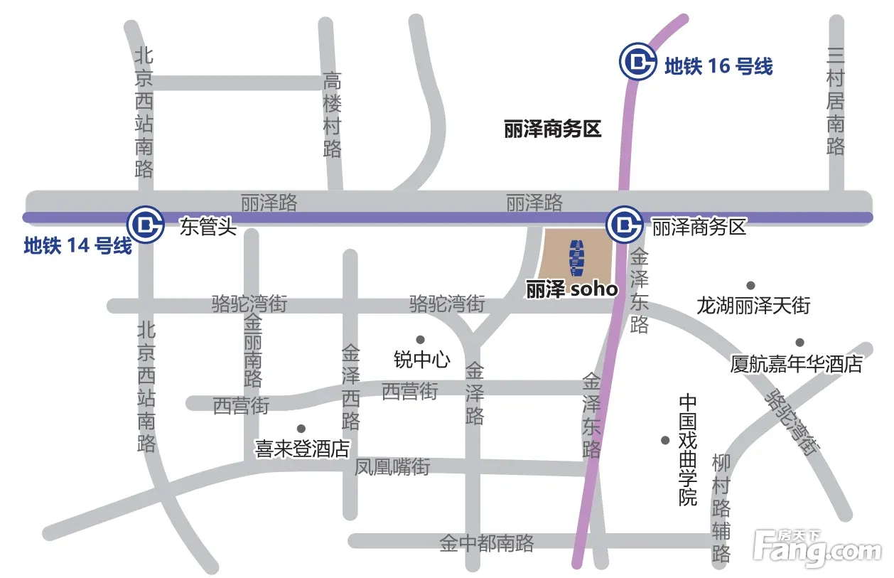 交通状况: 公路:南三环、南四环,京开高速、京港澳高速、京雄高速等 地铁:16号线,14号线“丽泽商务区”站约50米 公交:74路 ; 83路 ; 458路 等