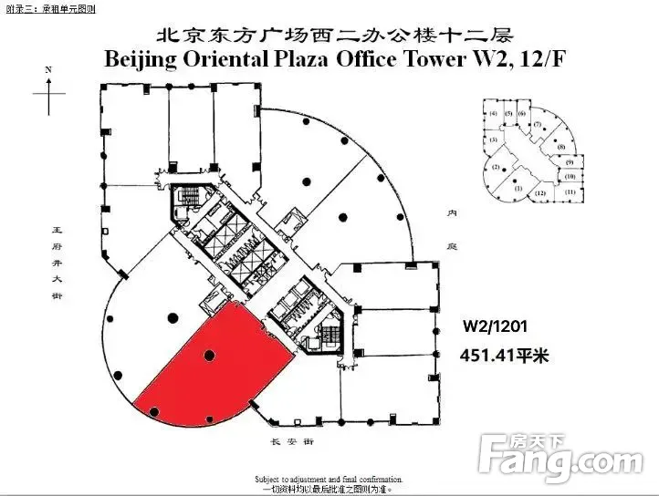 实价4.98元出租:东方广场451㎡,正对电梯厅,全新精装修