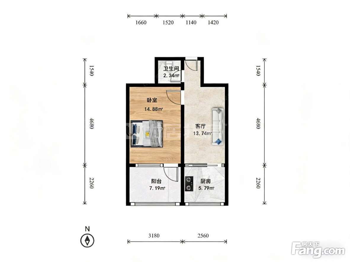 房子双朝南一居室,主卧朝南向带阳台,客厅厨房朝南带阳台,明厨暗卫;