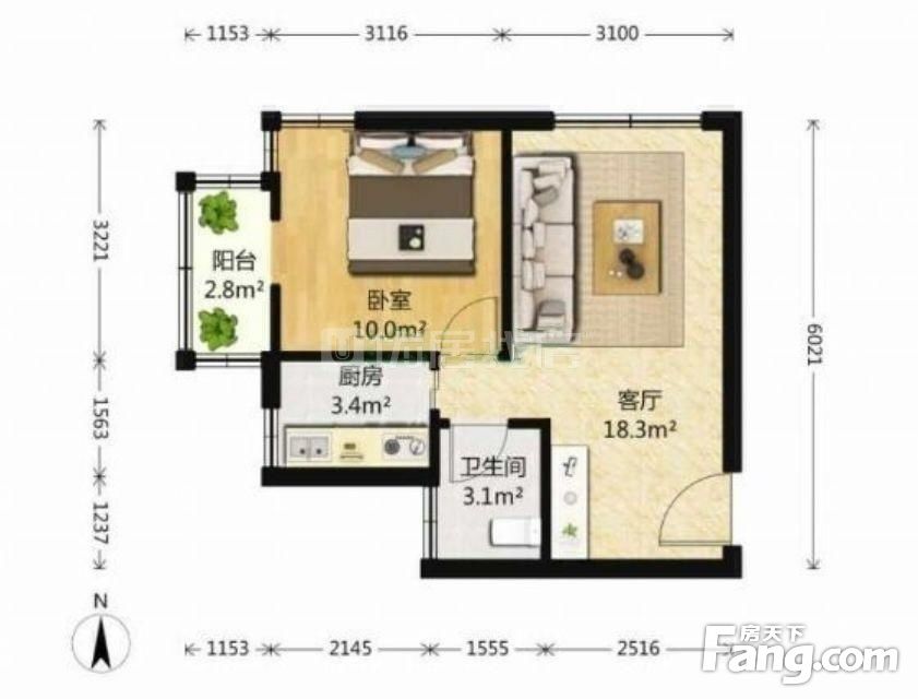 房源介绍: 海棠公社的1居,53.12平,6层/21层,西南向,带电梯, 户型布局: 客厅朝南向,25M2; 主卧朝西向,20.9M2; 厨房朝西向,4.8M2; 卫生间,3.0M2,无窗。