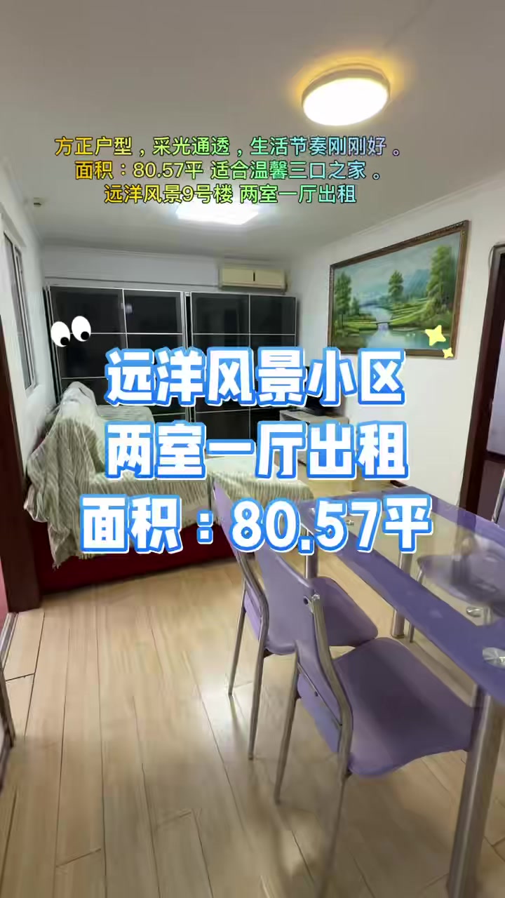 <br>核心卖点:双人床、单人床、衣柜、书桌、餐桌、沙发、电视柜、电视、冰箱、洗衣机、空调、热水器、燃气、暖气、网络;<br>户型介绍:本房为整租房源,户型为2室1厅1卫,建筑面积为80.57平米,朝向为东西。<br>小区信息:该房源所在小区为远洋风景小区,小区建筑年代约为2002年,物业公司为北京远洋基业物业管理有限公司,小区绿化率30.0%,小区共10栋楼。