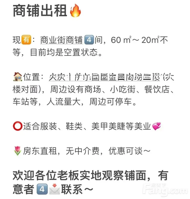 旺铺招租 ??租金:年付(可面谈)(含取暖物业) ?位置:金田商场内部二楼(大口对面) ??店铺面积:两间32㎡左右,两间属两户打通共58㎡左右 ??状态:空置中 重要的事情说三遍?????? 房东直租??房东直租??房东直租?? 没有中介费? 租金优惠均可谈?? ?随时看铺 想聊解的老板④信我~