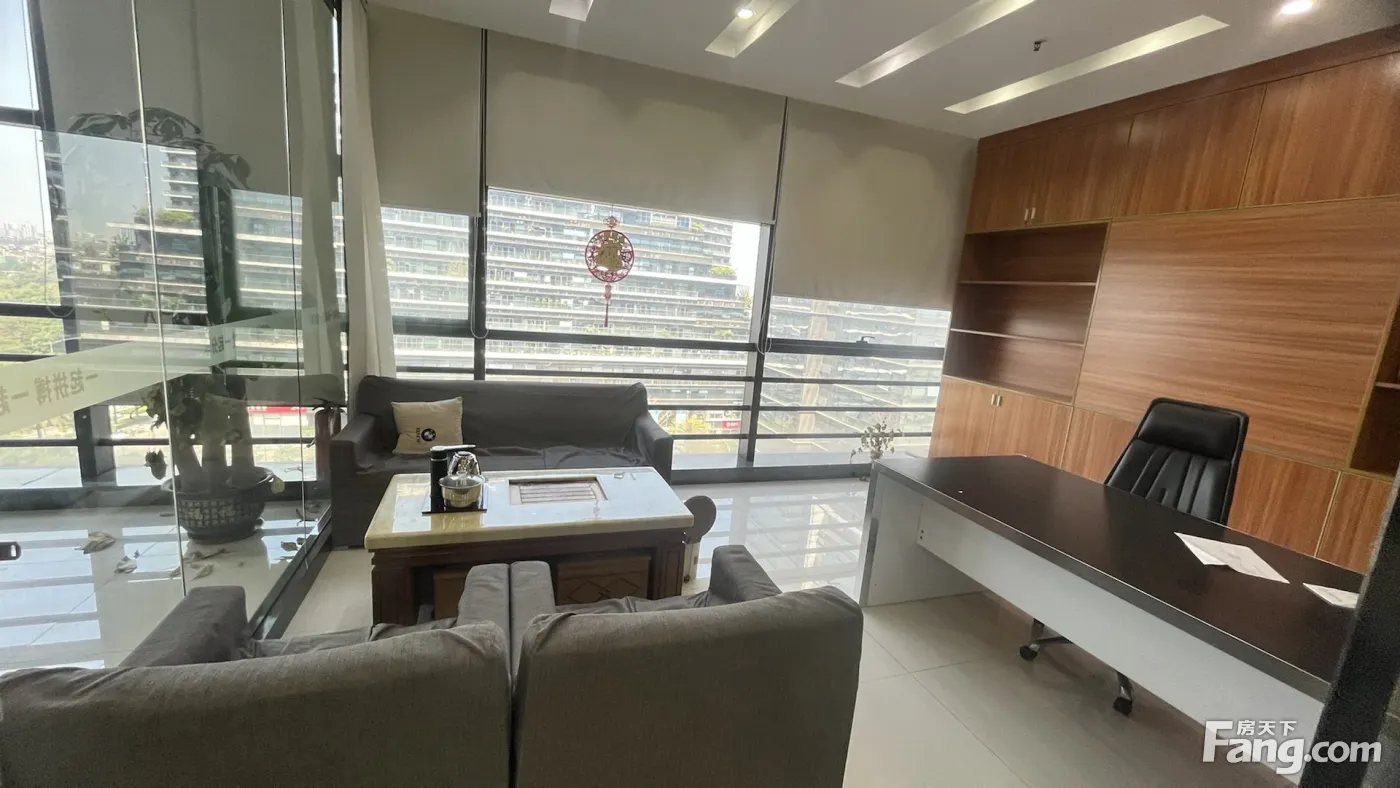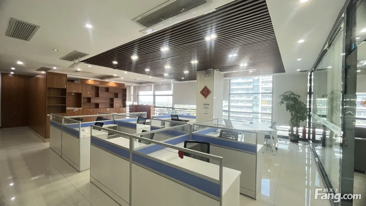 该写字楼位于高层电梯口位置,格局方正实用,前台大气有带一个室外转角大阳台,使用率高8成使用率,里面有一个总经理室、1个经理室、一个财务室、一个会议室、1个接待室共5个隔间,大厅光线好,大厅可以坐下20人左右办公,拎包就可以办公,装修保养新,业主直接出租,设备齐全,拎包即可办公不需要任何转让费,租金实惠
