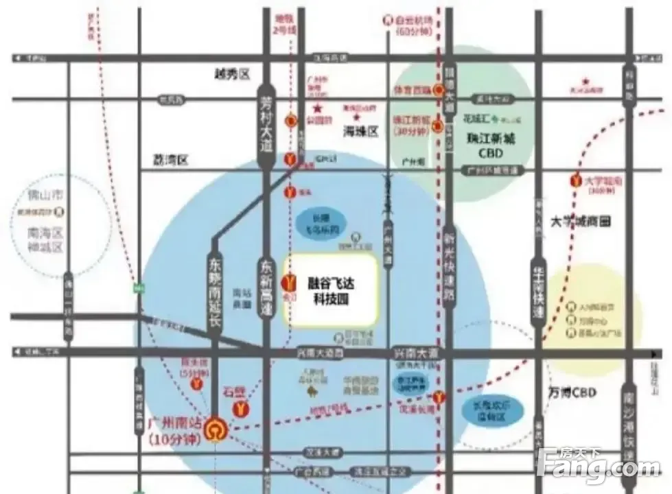 区位交通 【地 铁】广州2号线会江站A出口,2站广州南站,可快速换乘广州7号线大学城,以及换乘佛山地铁2号线;距广州地铁22号线陈头岗站仅1.5公里。 【快高速】园区坐落于番禺主干道-南大干线与东新高速交汇处。