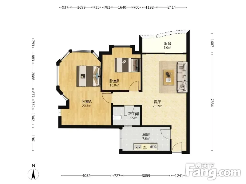 雅宝新城亚瑟公馆(五区) 2室1厅 95.0平米
