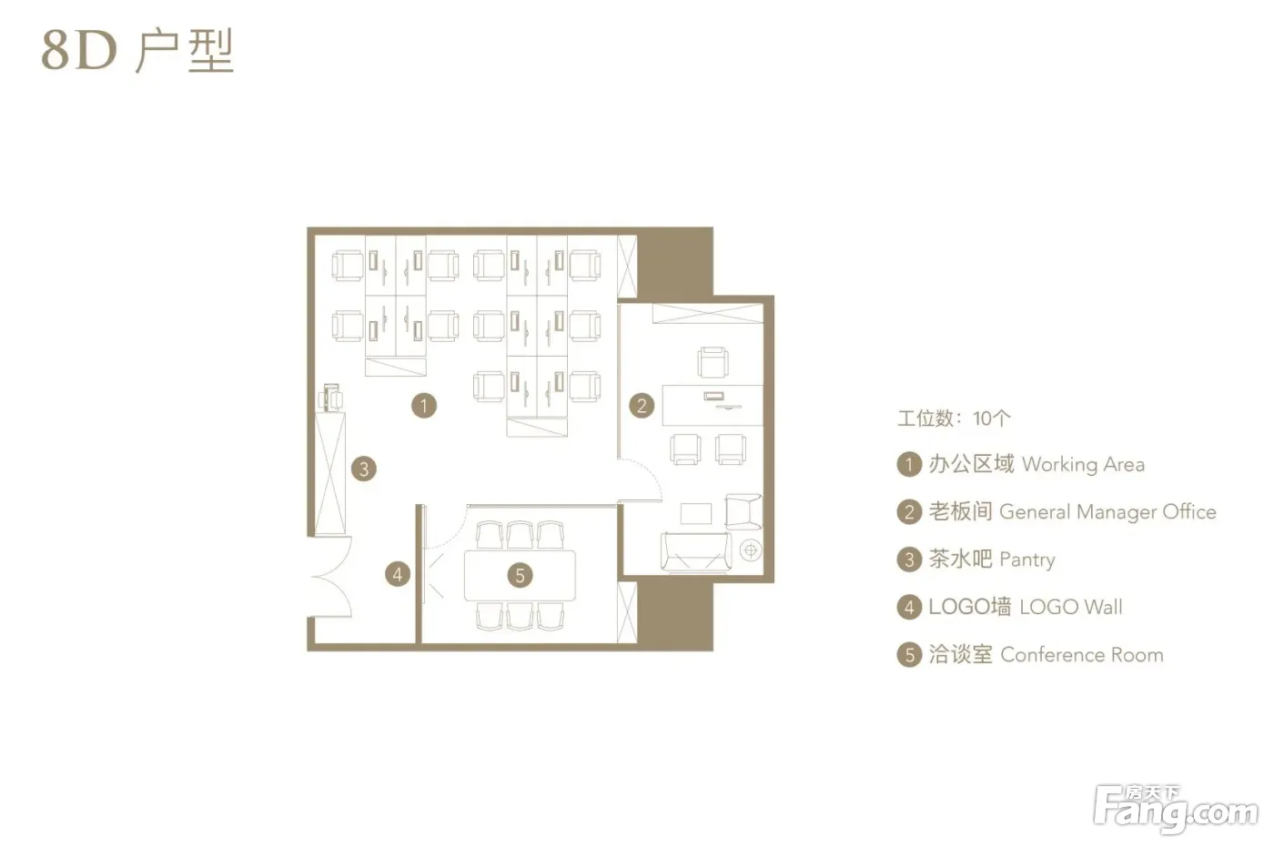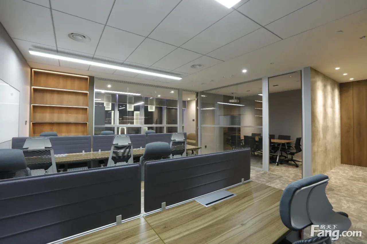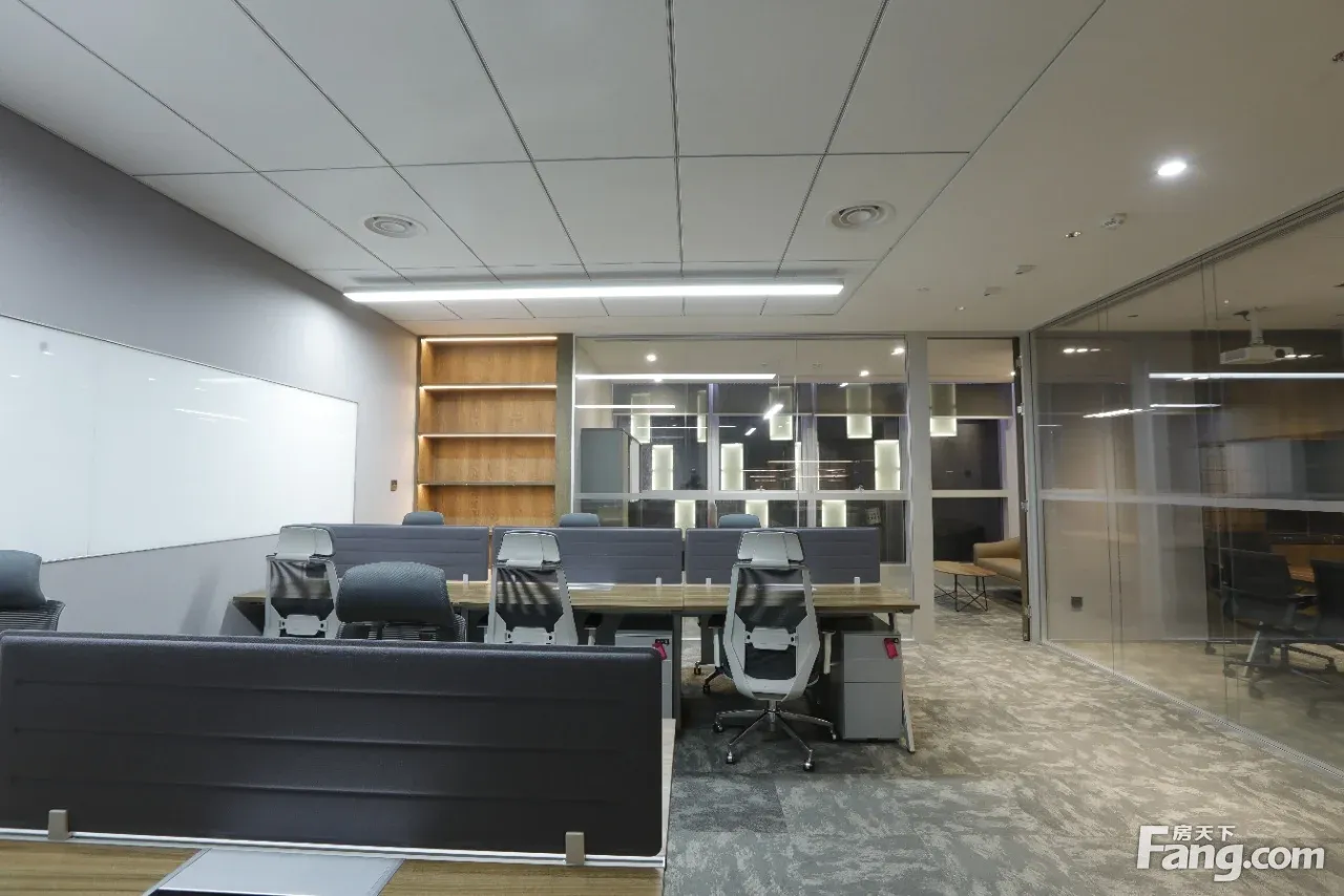 空间布局: 总裁室*1 会议室*1(可容纳6~8人) 敞开工位*10 朝向:东 配套服务:行政前台、共享会议室、共享休闲区域、室内保洁 户内配置:精装修带家具、大理石logo墙、独立茶水台(无上下水)、冰箱、饮水机、弱电机柜、投影幕布、白板 车位:月租:1800/月(押三付一);时租:15元/(120元/天封顶)