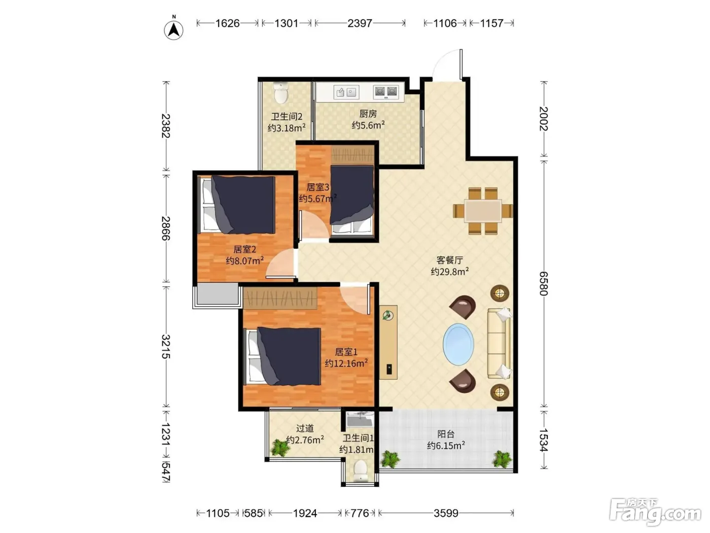 星光之约花园 3房2厅2卫 77.86㎡