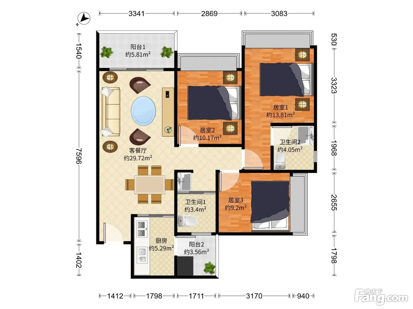 鸿荣源博誉府 3房2厅2卫 96㎡
