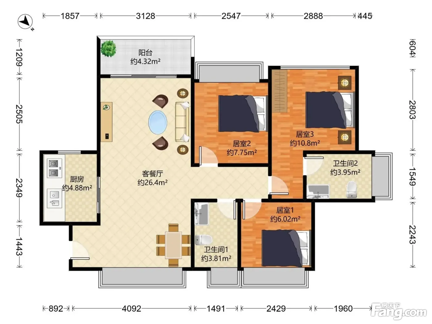 天鹅湖畔花园 3房2厅2卫 88.44㎡