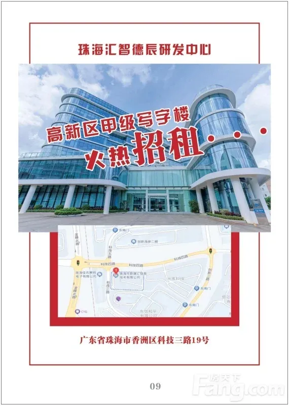 珠海高新区 ·高端办公空间出租|汇智德辰研发中心 汇智德辰研发中心,位于珠海国家高新区核心——科技路,是一座集高端办公、完善配套与产业生态于一体的独立园区。我们致力于为企业提供超越期待的办公解决方案,助力发展,汇聚英才。 项目核心亮点! 1.交通极便利 :至珠海北站,直达香洲;紧邻三大高速,1小时畅达广深港澳;深中大桥直连深圳,实现“1小时珠三角圈”。 2.园区独享 :占地约7000㎡独立园区,空间灵活,提供50㎡起至整层1600㎡多样户型,环境静谧、绿意盎然,安保周全,专注办公。 3商业配套全 :步行即达宝龙城商业综合体,餐饮、购物、娱乐一站式满足。 4.会议多功能 :配备多个专业培训室与LED大屏,可承办发布会、路演、年会等活动。 5.餐宿好解决 :设有员工餐厅与高品质自助餐厅;配套32间酒店式公寓,满足商旅需求。 6.物业有管家 :提供24小时安防、设施维保、保洁、快递代管等贴心服务,做您的专属后勤保障。 即刻入驻,赋能发展 汇智德辰研发中心,以全维度的硬件配套与软性服务,静候您的企业入驻,共谋发展!