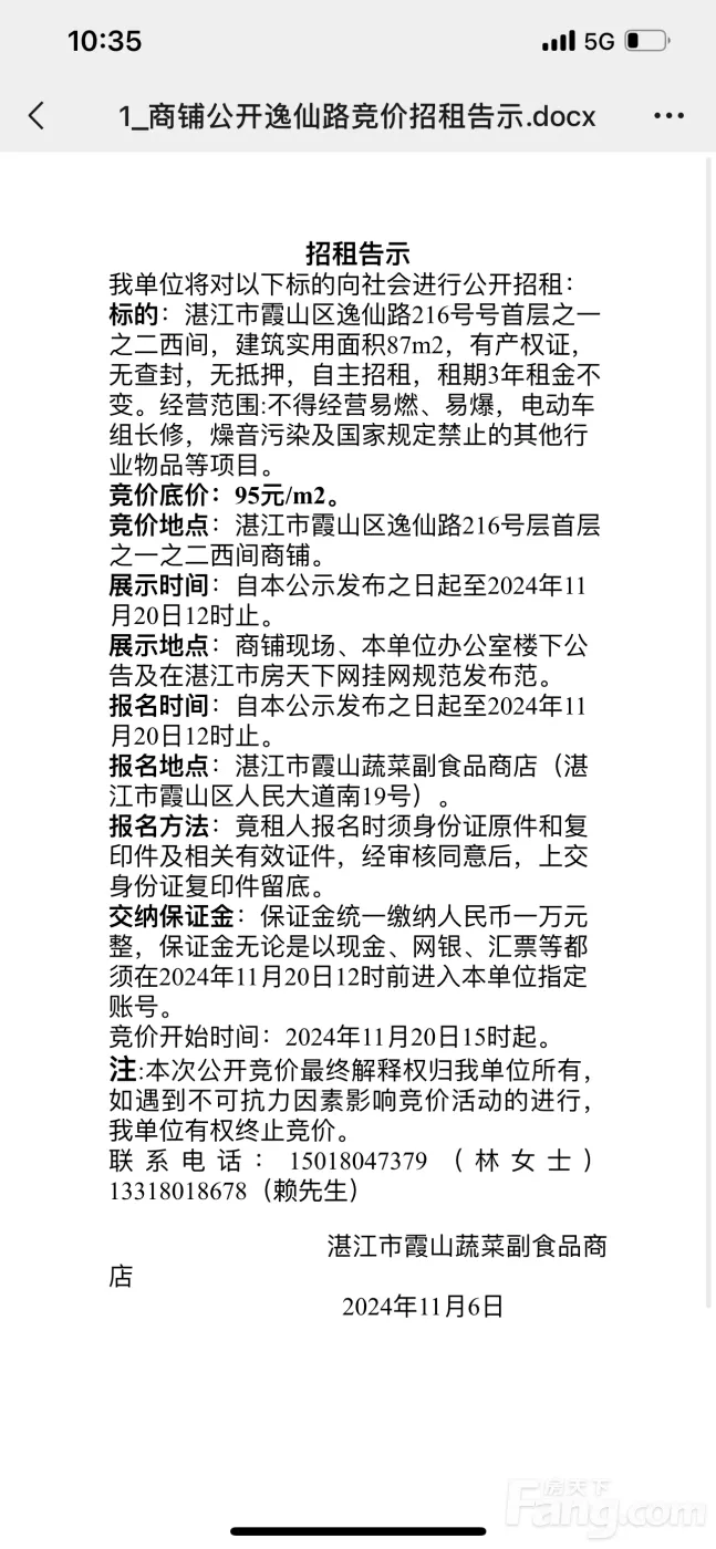 我单位将对以下标的向社会进行公开招租: 标的:湛江市霞山区逸仙路216号号首层之一之二西间,建筑实用面积87m2,有产权证,无查封,无抵押,自主招租,租期3年租金不变。经营范围:不得经营易燃、易爆,电动车组长修,燥音污染及国家规定禁止的其他行业物品等项目。 竞价底价:80元/m2。 竞价地点:湛江市霞山区逸仙路216号层首层之一之二西间商铺。 展示时间:自本公示发布之日起至2025年12月1日12时止。 展示地点:商铺现场、本单位办公室楼下公告及在湛江市房天下网挂网规范发布范。 报名时间:自本公示发布之日起至2025年12月1日12时止。 报名地点:湛江市霞山蔬菜副食品商店(湛江市霞山区人民大道南19号)。 报名方法:竟租人报名时须身份证原件和复印件及相关有效证件,经审核同意后,上交身份证复印件留底。 交纳保证金:保证金统一缴纳人民币一万元整,保证金无论是以现金、网银、汇票等都须在2025年12月1日12时前进入本单位指定账号。 竞价开始时间:2025年12月1日15时起。