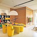 四平八稳环绕式收纳柜,极具气势的嵌入餐厅的墙面,并设计出明黄色的卡座,一举打破棕木带来的深沉,使空间全面活泼起来。极具造型感的秋千灯,营造出柔和的光感,黑色和白色也形成鲜明对比。